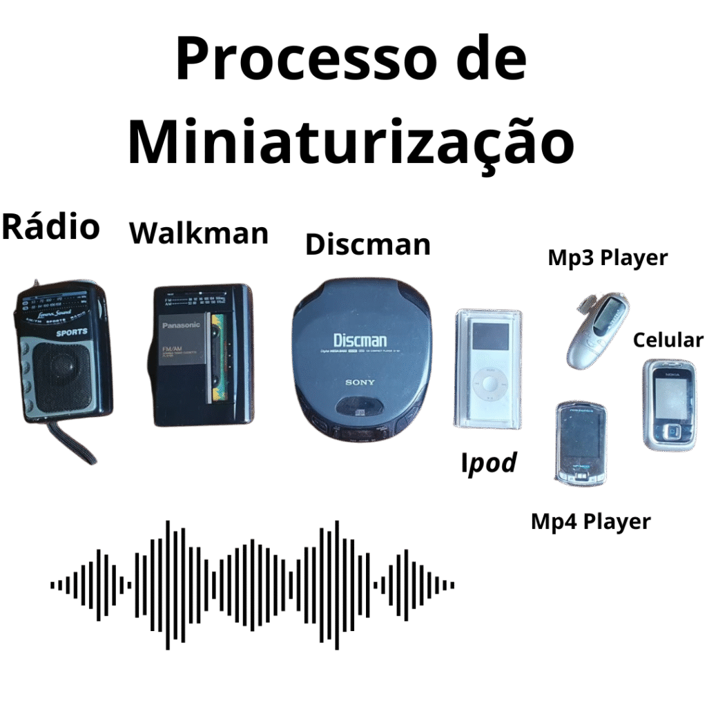 Neste sentido, a forma como consumimos produtos audiovisuais no último século passou por um processo de miniaturização passando das apresentações ao vivo, programas de rádio, discos de vinil, computadores, fitas cassetes, compact discs, discmans , formato de áudio mp3/mp4, Ipod/mp3 player, desenvolvimento da internet, computadores celulares.